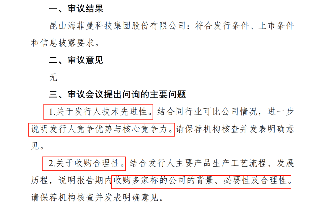 不过,上述解释依旧没有打消监管机构的关注。审议会议公告显示,在审议会议上,北交所又再次问及海菲曼收购多家标的公司的背景、必要性及合理性,并要求保荐机构核查现场发表明确意见。