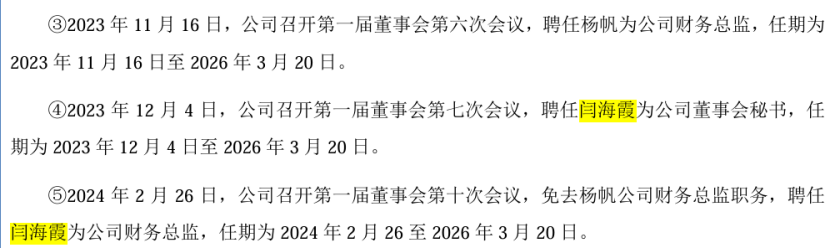 先是2023年11月16日,公司在第一届董事会第六次上宣布聘任杨帆为公司财务总监,任期为2023年11月16日至2026年3月20日。