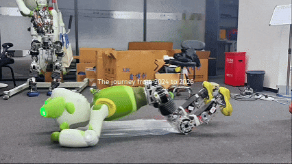 这一能力验证了其关节的大扭矩爆发力与全身协同规划水平。它意味着爱湫将可以不再依赖人工辅助,能实现从静止平躺到完全站立的独立冷启动,做到‘开机即站立,站立即作业’,证明了其运动底座已趋于成熟。