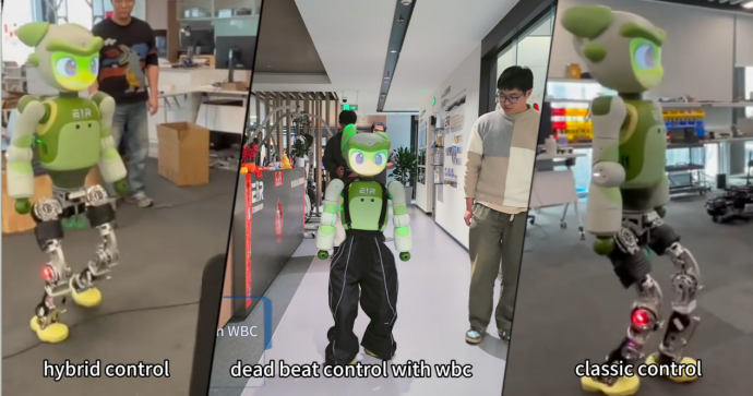 根据EIR四川具身科技近期披露的视频,爱湫底层运控架构采用了Hybrid Control(混合控制)、Classic Control(经典控制)与Dead-beat Control(无拍控制)等策略,确保了机器人在高动态场景下的步态稳定性与动作精准度。