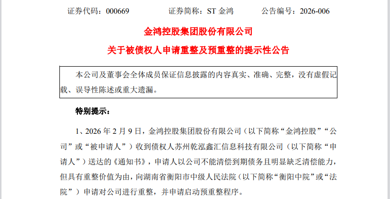 在股价飙涨前,ST金鸿于2月9日公布了一份有关公司被债权人申请重整及预重整的提示性公告。公司称,其于当日收到申请人发来的《通知书》,申请人以公司不能清偿到期债务且明显缺乏清偿能力,但具有重整价值为由,向衡阳中院申请对公司进行重整,并申请启动预重整程序。